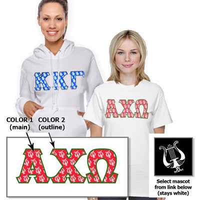 This Sorority package deal comes with an unisex/men's sized Hooded Sweatshirt and T-Shirt, both garments feature the Mascot Letter design printed on the front. Great for Big or Little Sisters. You can select a different mascot for each and even make them for different Sororities if you would like. Color 1 will be used for the main background color and Color 2 will be used for the outline color. The Mascot will always be printed in White. The garments only come in White. Please write-out the full Sorority names below--we will always use the Greek Symbols.