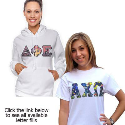 This package comes with an unisex/men's sized Hooded Sweatshirt and T-Shirt, both featuring panoramic pattern, Greek Symbols on the front. Get one for you and one for your Big Sister or Boyfriend. You can pick Panoramic Patterns for both garments below and even order them for different organizations if needed. Please write out the full organizations' names--both garments will always use the Greek Symbols. The garments only come in White.