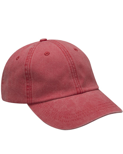 Cap Features: Adams brand; 100% pigment-dyed garment-washed cotton twill; 6-panel, unstructured, low-profile; tuck-away leather back strap with antiqued brass buckle and grommet; Cool-Crown mesh lining; four rows of stitching on bill.