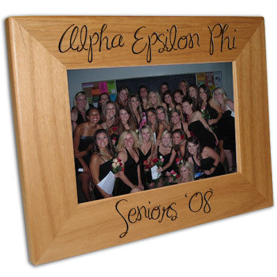 Sorority Seniors laser engraved 4x6 wooden picture frame can be customized for any organization! Just select your organizations' name and write out the year you would like engraved as well. Frame will look exactly as shown, the year will be the last 2 numbers of the year that you entered with an apostrophe before the digits. Dimensions of frame are 5 inches x 7 inches, it holds a 4x6 picture, walnut wood with an easel back and glass window front. Frames can hang or stand, horizontally. Rush service is available for 20% of the total price, this service can be selected during checkout.
