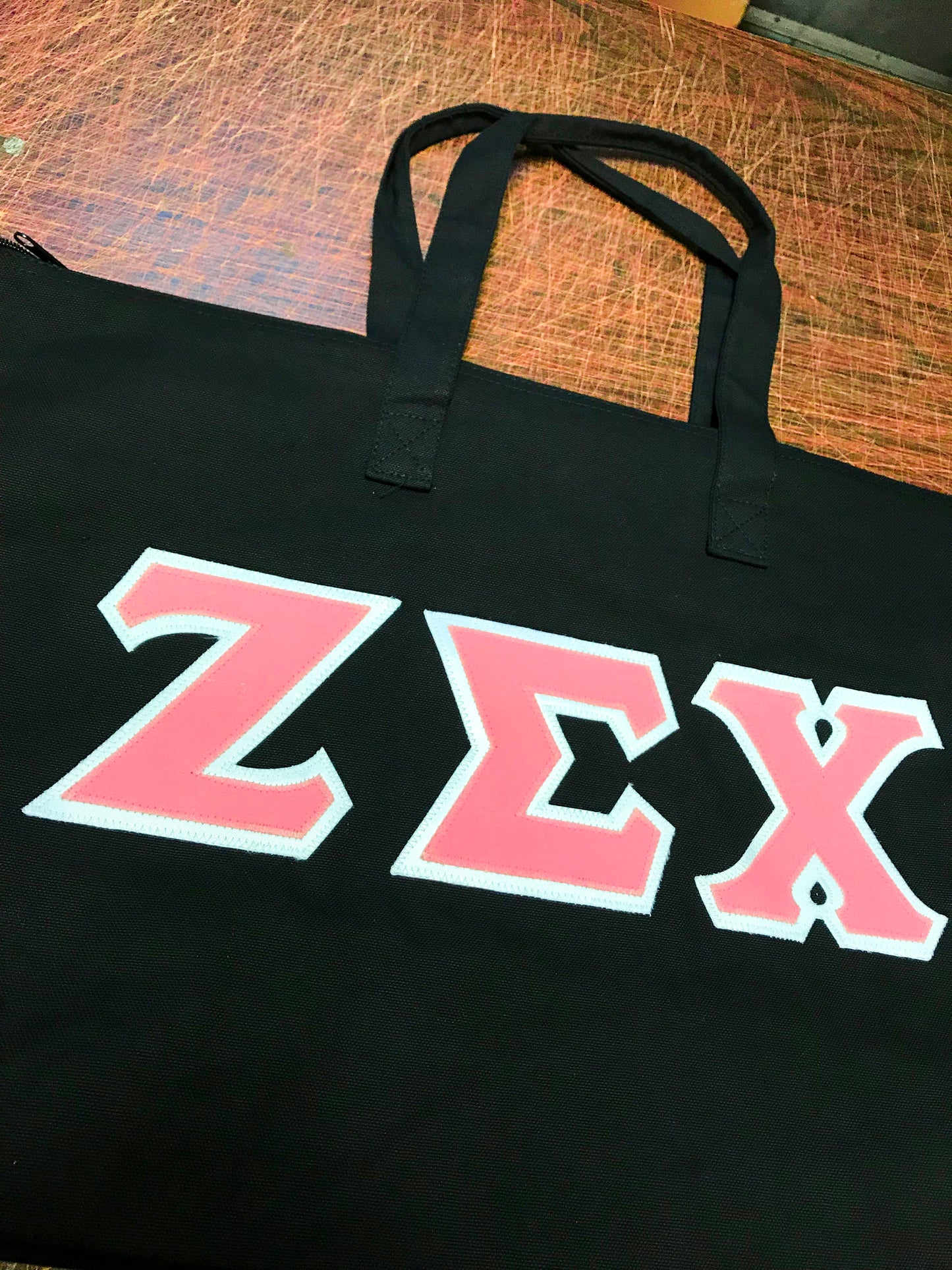 This Sorority letter shoulder tote bag is perfect for around the campus! Your Greek letters measure 4-inches in height and can be personalized with your choice of pattern and border.