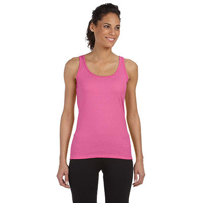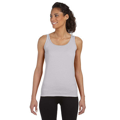Tank Features: Gildan brand; 100% cotton deluxe 30-singles SoftStyle yarn, Sport Grey is 90% cotton and 10% polyester; 4.5-ounce; wide straps; satin label; rib knit trim applied to neckline and armhole; sideseam construction with stylish tapered cut; double-needle bottom hem; feminine fit.