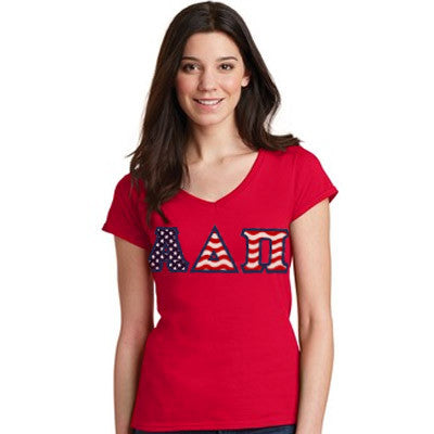 Shop our best-selling Sorority V-Neck Shirt by Bella + Canvas with our custom Stars & Stripes Greek letter pattern! Customize the border color any way you want. The custom twill Greek letters measure 4” in height and are sewn horizontally across the chest.