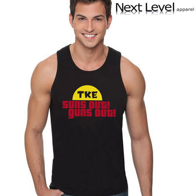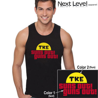 This Fraternity tank comes with the Suns Out, Guns Out design printed on the front in two colors. Color 1 will be used for the sun color and Color 2 will be used for the text color. Please select your Fraternities' Greek letters - we will always use the Greek Symbols on this tank.