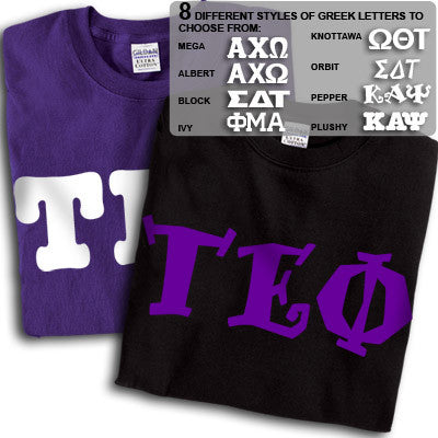 Get 2 Tau Epsilon Phi printed t-shirts for almost the same price as getting one! 8 fonts and multiple colors to choose from. Gildan 5.3oz. 100% cotton, preshrunk t-shirts. Double-needle stitching throughout, seamless topstitched collar, taped neck and shoulders. Ash color is 99% cotton, 1% polyester, Sports Grey color is 90% cotton, 10% polyester, Heather Cardinal, Dark Heather and Heather Indigo are 50% cotton and 50% polyester. Rush service is available for 20% of the total price, this option is available during checkout. This is a PRINTED item. This item does NOT have sewn on twill letters. Any questions, please contact customer service.