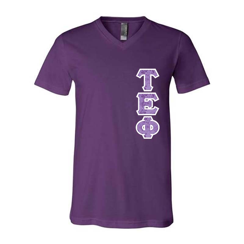 Customize our best-selling Greek Fraternity V-Neck Shirt by Bella + Canvas with your Tau Epsilon Phi letters! Choose from over 450+ different Greek letter twill designs, colors and patterns. The custom twill Greek letters measure 4” in height and are sewn vertically down the left side.