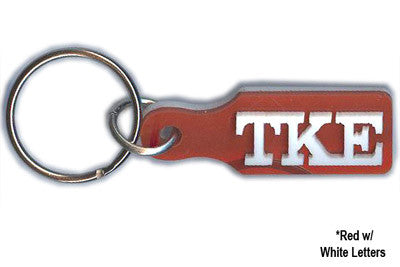 Tau Kappa Epsilon paddle keychain comes as shown. It is made up of plastic with a metal key ring. Rush service is available for 20% of the total price and can be selected during checkout.