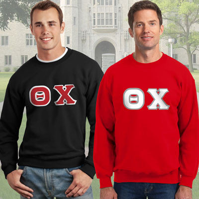 Buy 2 9-ounce crewneck Theta Chi Gildan sweatshirts and save money! Crewneck sweatshirts will come with 4-inch Theta Chi twill sewn-on letters. Sweatshirts are unisex/men's sized.