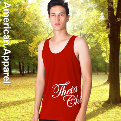 This American Apparel Unisex/Men's Sized printed tank top features a nice loose drape perfect for the summer heat. This tank comes with Theta Chi written out in the location and scripted font shown in the picture. This is a Printed garment - tank does NOT have twill sewn-on letters. Color: Brown only comes in sizes XS-L.