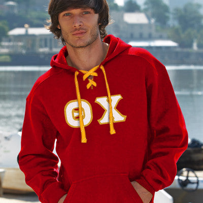 This sport laced hockey hooded sweatshirt comes with the Theta Chi Greek symbols in 4-inch twill sewn-on letters across the chest. Comes with white laces and an extra set in the color of your choice! This is a Unisex/Men's sized garment - if you have any questions please click on sizing chart below.