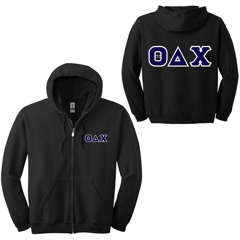 Customize our best-selling Greek Full-Zip Unisex Hoodie with your Theta Delta Chi letters! Choose from over 450+ different Greek letter twill designs, colors and patterns. You can choose to have custom 2" Greek Letters across the left chest, 4" Greek Letters across the upper back, or both placements!