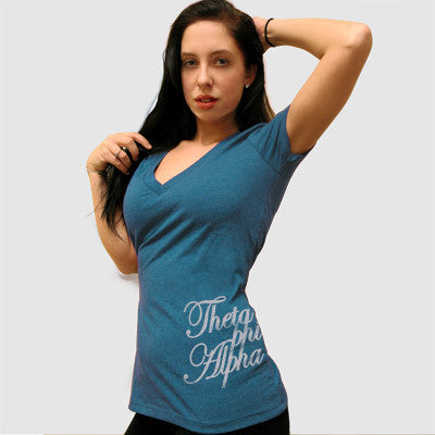 This Next Level Apparel Deep V printed tee comes with Theta Phi Alpha written out in the font and in the location show in the picture. This is a printed item that is sized for women.