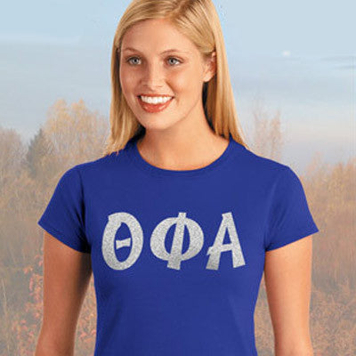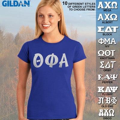 This Gildan ladies' tee is made up of the brand new Soft Style material and comes with the Theta Phi Alpha Greek symbols printed across the front in 3-inches in the font of your choice. This is a printed item and does NOT have twill letters.