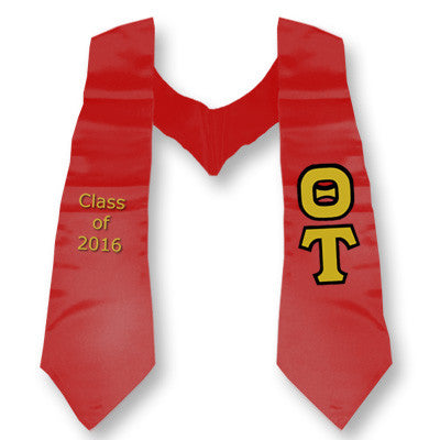 This Theta Tau Satin Graduation Stole measures 5" x 72" and features 3-inch sewn-on Greek letters down the left side. Customize by stole color, pattern color, and border color.