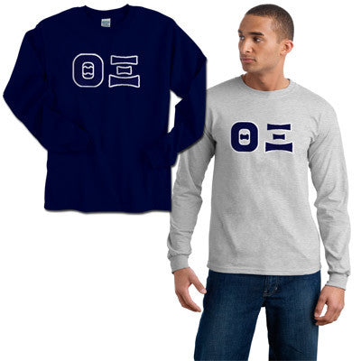This Theta Xi longsleeve package comes with two longsleeve t-shirts that have Theta Xi Greek Symbols in 4-inch twill sewn-on letters on the front. These shirts are unisex/men's sized.