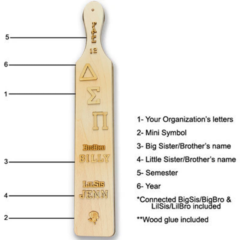 A great Package to save you TIME and MONEY. This 22 inch Unfinished Paddle Package comes with all the parts you need to design a great gift. It is unfinished which makes it great not just for cost but great to Paint! Included are the following: 1- Select Your Greek Organization's Letters. 2- Select a Symbol. 3- Enter the first name of the Big Brother/Sister. 4- Enter the first name of the Pledge - Little Brother/Sister. 5- Select Semester. 6- Enter the Year. We even include two of our decorative Connected Letters for your BigBro/LilBro or BisSis/Lil Sis and a bottle of glue!!! Paddles are unassembled, allowing you to design & assemble as you like. Assembly takes about 30 minutes. All orders include a bottle of our clear-drying wood glue. WE will choose the sizes of lettering so names fit attractively - the paddle pictured is just for example purposes - you may not get the size/style letters pictured. Rush service is available for 15% of the total price.