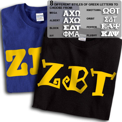 Get 2 Zeta Beta Tau printed t-shirts for almost the same price as getting one! 8 fonts and multiple colors to choose from. Gildan 5.3oz. 100% cotton, preshrunk t-shirts. Double-needle stitching throughout, seamless topstitched collar, taped neck and shoulders. Ash color is 99% cotton, 1% polyester, Sports Grey color is 90% cotton, 10% polyester, Heather Cardinal, Dark Heather and Heather Indigo are 50% cotton and 50% polyester. Rush service is available for 20% of the total price, this option is available during checkout. This is a PRINTED item. This item does NOT have sewn on twill letters. Any questions, please contact customer service.