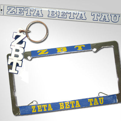 Catered specifically for Zeta Beta Tau, this special package includes everything you need for your car! (1) Zeta Beta Tau License plate (1) Zeta Beta Tau letter keychain (1) Zeta Beta Tau car decal. Rush service is available for a fee of 20% of total.