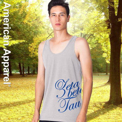 This American Apparel Unisex/Men's Sized printed tank top features a nice loose drape perfect for the summer heat. This tank comes with Zeta Beta Tau written out in the location and scripted font shown in the picture. This is a Printed garment - tank does NOT have twill sewn-on letters. Color: Brown only comes in sizes XS-L.