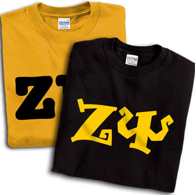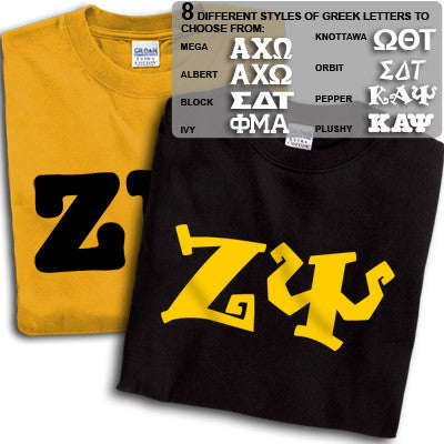Get 2 Zeta Psi printed t-shirts for almost the same price as getting one! 8 fonts and multiple colors to choose from. Gildan 5.3oz. 100% cotton, preshrunk t-shirts. Double-needle stitching throughout, seamless topstitched collar, taped neck and shoulders. Ash color is 99% cotton, 1% polyester, Sports Grey color is 90% cotton, 10% polyester, Heather Cardinal, Dark Heather and Heather Indigo are 50% cotton and 50% polyester. Rush service is available for 20% of the total price, this option is available during checkout. This is a PRINTED item. This item does NOT have sewn on twill letters. Any questions, please contact customer service.