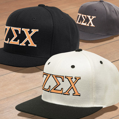 This Yupoong cap comes with a classic snapback closure and a flat visor and comes with the Zeta Sigma Chi greek symbols embroidered on the front. This cap features 2-color embroidered letters. One size.