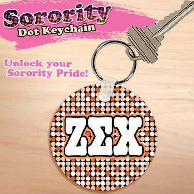 Another Something Greek Exclusive Product, our Zeta Sigma Chi Sorority Dot Keychain comes with both sides of the keychain printed. Keychain comes as shown.