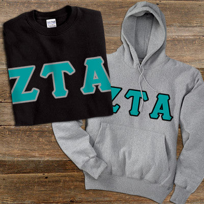 Zeta Tau Alpha hoody / t-shirt pack comes with 4 inch twill Greek letters sewn on the front of both garments. Hoody: Gildan 7.75oz unisex/men's sized hooded sweatshirt, 50% cotton and 50% polyester. T-Shirt: Gildan 5.3oz unisex/men's sized t-shirt, 100% cotton, preshrunk. Rush service is available for a fee of 20% of the total price, this service can be selected during checkout.